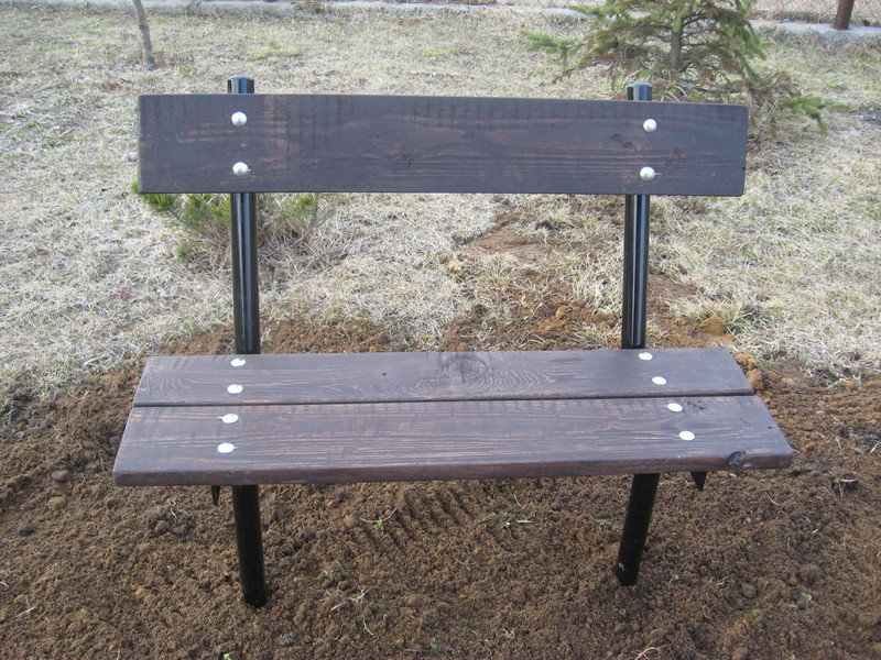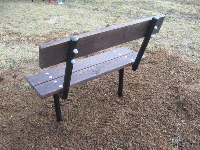 Stelaże są wykonane z rury fi 35 mm. oraz kątownika 35x35 mm. Całość jest spawana półautomatem i jest wykonana estetycznie, maluję farbą podkładową oraz nawierzchniową. Listwy są drewniane o wymiarach 30x150x800 mm. pokryte dwukrotnie impregnatem. Listwy są przykręcane do stelaży śrubami M 8 ocynkowanymi, na nakrętki są zakładane maskownice które nadają estetyczny wygląd oraz zabezpieczają przed uszkodzeniem ciała. Ławka może być wykonana w dowolnym kolorze, zarówno części metalowe jak i drewniane. Ławka musi być wkopana lub zabetonowana.