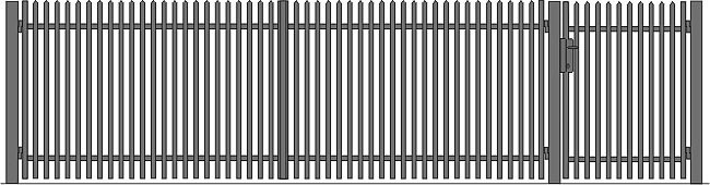 Dwa skrzydła wjazdu, furtka o szerokości 1 m, 3 słupki z rury Ø 90 mm (3”) ze specjalnymi zawiasami uniemożliwiającymi zdjęcie zamkniętej bramy lub furtki, zamek, klamka.