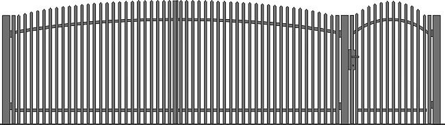 Dwa skrzydła wjazdu, furtka o szerokości 1 m, 3 słupki z rury Ø 90 mm (3”), zamek, klamka.