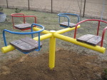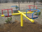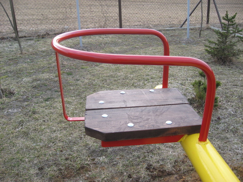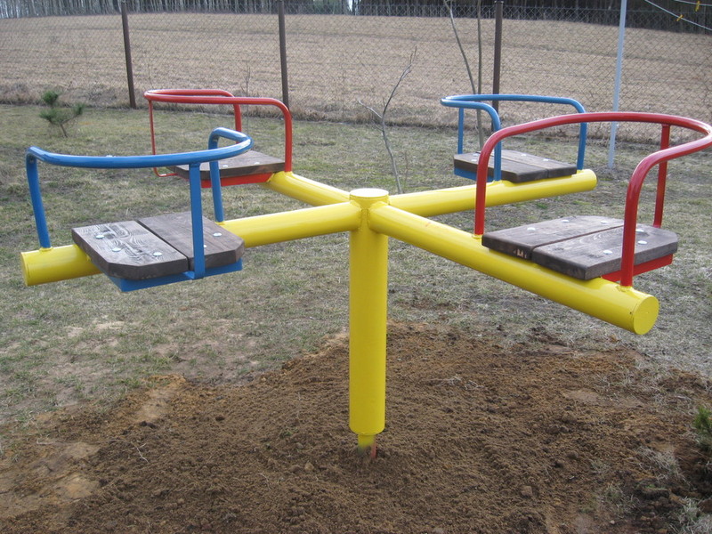 Ramiona karuzeli wykonane są z rury fi 76x2 mm.o długości całkowitej 1800 mm. Podstawę stanowi rura fi 100 mm. o wysokości 700 mm. w której zamocowane są łożyska stożkowe. Wałek ma średnicę fi 55 mm. i długość 1000 mm. Połowa wraz z kotwami jest zamocowana w ziemi. Oparcia przy siedziskach są wykonane z rury fi 25 mm. zaś podstawę stanowi kątownik hutniczy 35x35 mm. Do podstawy z kątownika przymocowane są siodełka wykonane z desek o grubości 30 mm. pomalowane impregnatem. Części metalowe są pomalowane farbą podkładową oraz nawierzchniową. Można zastosować dowolne kolory, lub wersję bez siodełek.